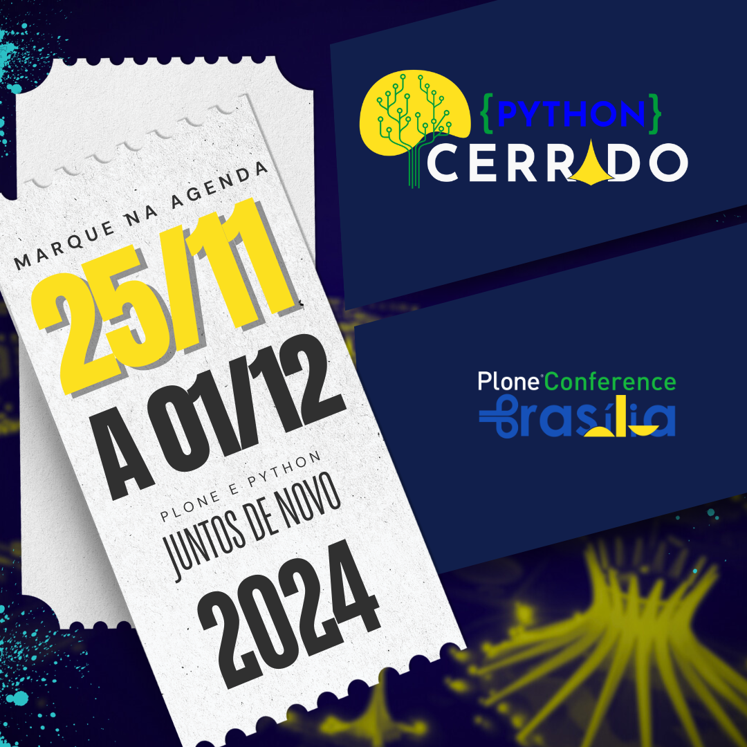 Temos o prazer de anunciar que a Plone Conference 2024 e a Python Cerrado 2024 serão realizadas de 25 de novembro a 1º de dezembro, em Brasília, Brasil.